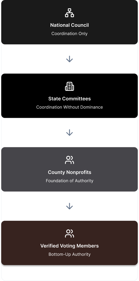 We are a civic framework built on clarity, structure, and lawful participation. Our focus is to establish transparent, member-governed nonprofit entities at the county level that coordinate upward through clearly defined processes. By prioritizing documentation, accountability, and proper legal foundations, we aim to create durable civic infrastructure that protects both the organization and its members.